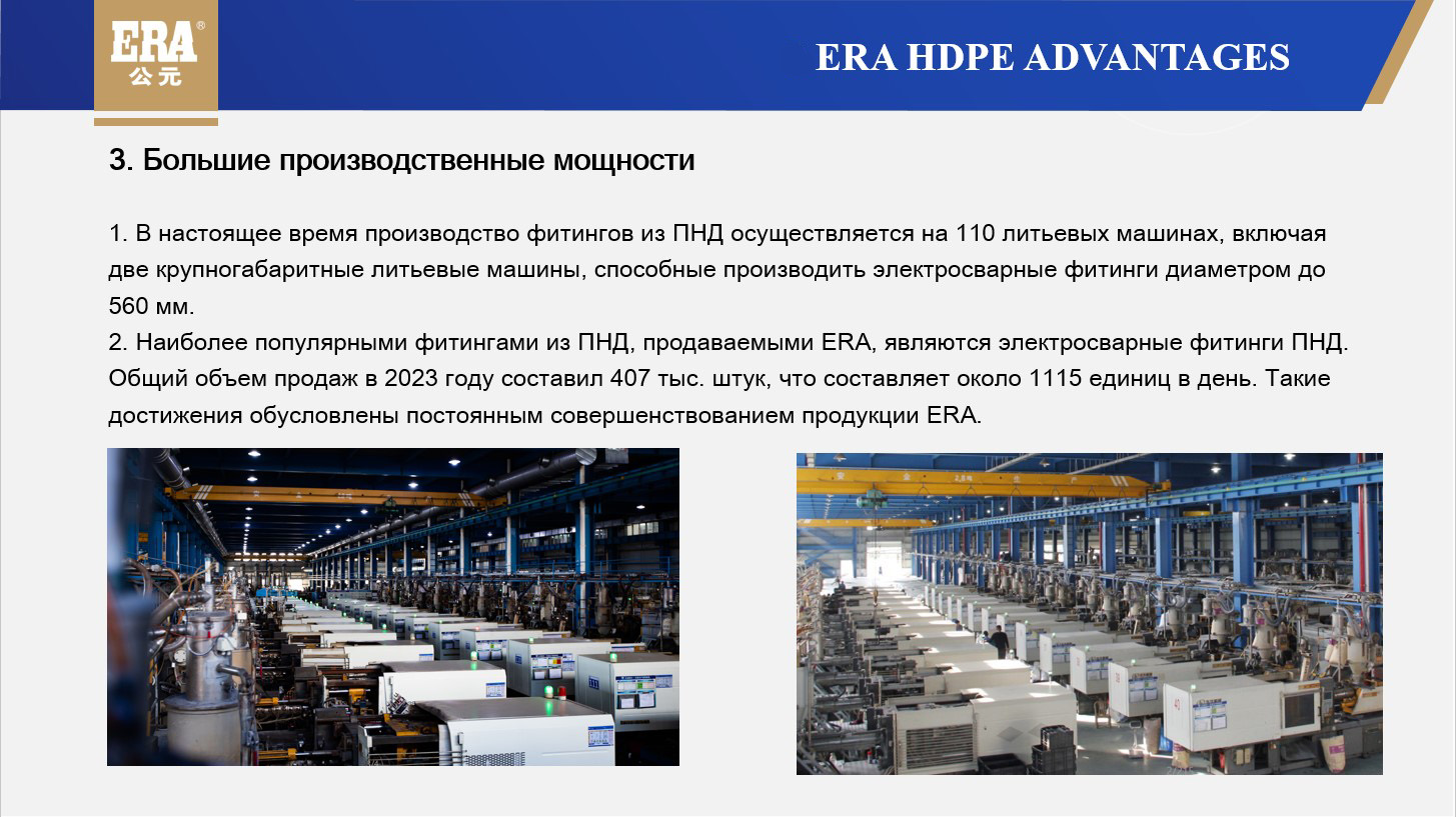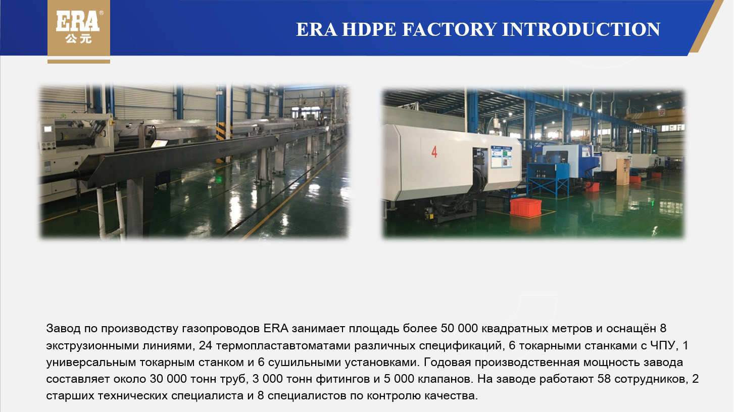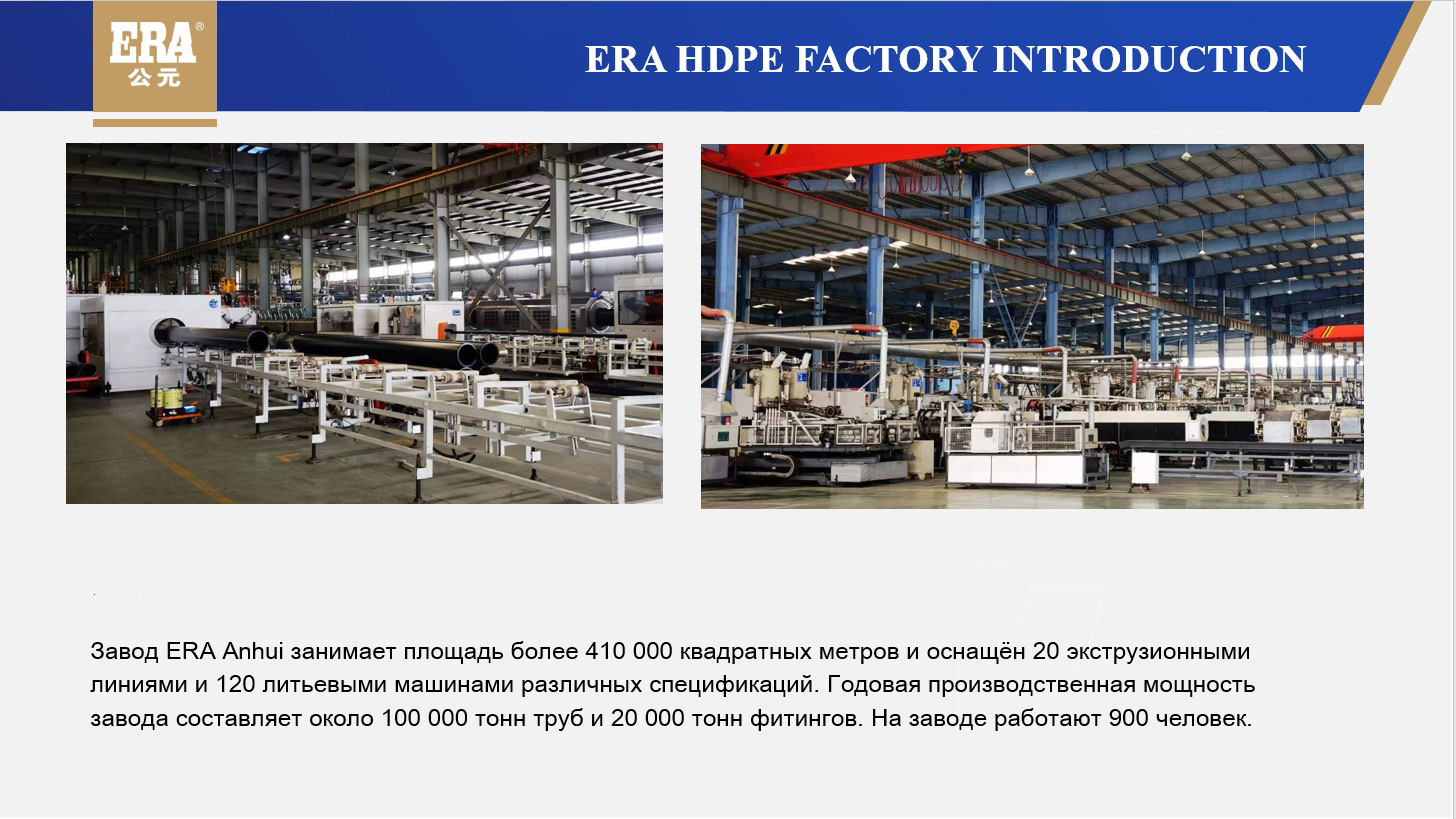 1. Компания ERA основанная в 1983 году, является ведущим производителем в Китае, специализирующимся на трубопроводных системах из ПЭ, ПП, ПВХ, ХПВХ, ППР. Имея годовую производственную мощность 600 000 тонн, компания ERA Co., ltd имеет более 8 000 сотрудников на 12 заводах площадью 1 332 000 квадратных метров в Китае. Оснащено 900 литьевыми машинами, 300 экструзионных машин и 12 000 форм, оборот продаж ERA в 2023 году достиг 1 500 000 000 долларов США, в том числе экспортные продажи охватывают 146 стран мира.