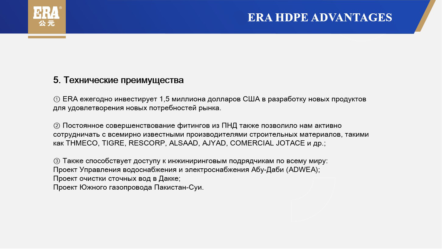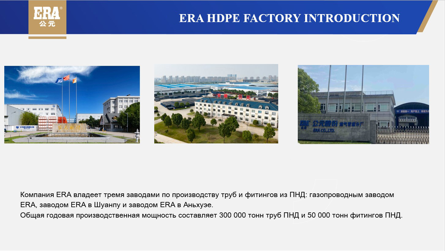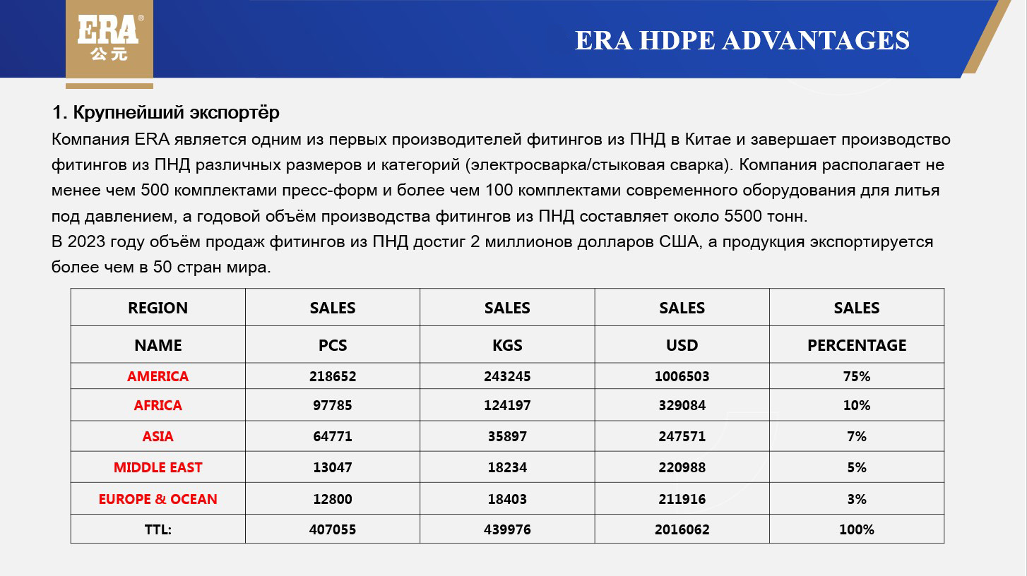 1. Компания ERA основанная в 1983 году, является ведущим производителем в Китае, специализирующимся на трубопроводных системах из ПЭ, ПП, ПВХ, ХПВХ, ППР. Имея годовую производственную мощность 600 000 тонн, компания ERA Co., ltd имеет более 8 000 сотрудников на 12 заводах площадью 1 332 000 квадратных метров в Китае. Оснащено 900 литьевыми машинами, 300 экструзионных машин и 12 000 форм, оборот продаж ERA в 2023 году достиг 1 500 000 000 долларов США, в том числе экспортные продажи охватывают 146 стран мира.
