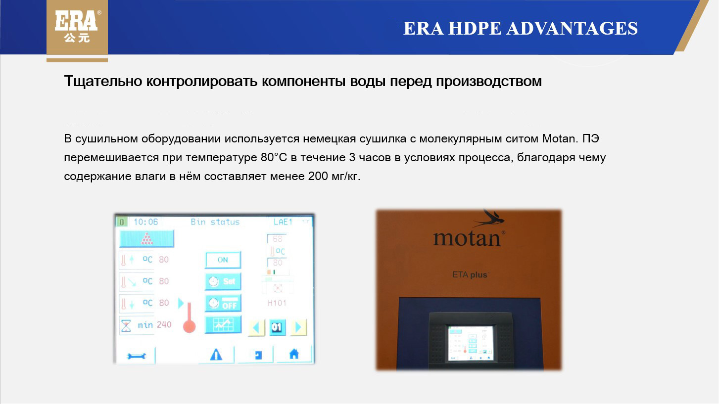 2. Для производства труб ПНД всего 16 экструзионных линий, в том числе 12 производственных линий немецкой компании Battenfeld-Cincinnati., оснащен 8 автоматическими упаковочными машинами для трубных мешков и 8 ультразвуковыми детекторами толщины стенок. Годовая мощность 43 000 тонн; для производства фитингов из ПНД всего 150 литьевых машин весом от 200 г до 45 000 г, ежегодно грузоподъемность более 3 000 тонн.